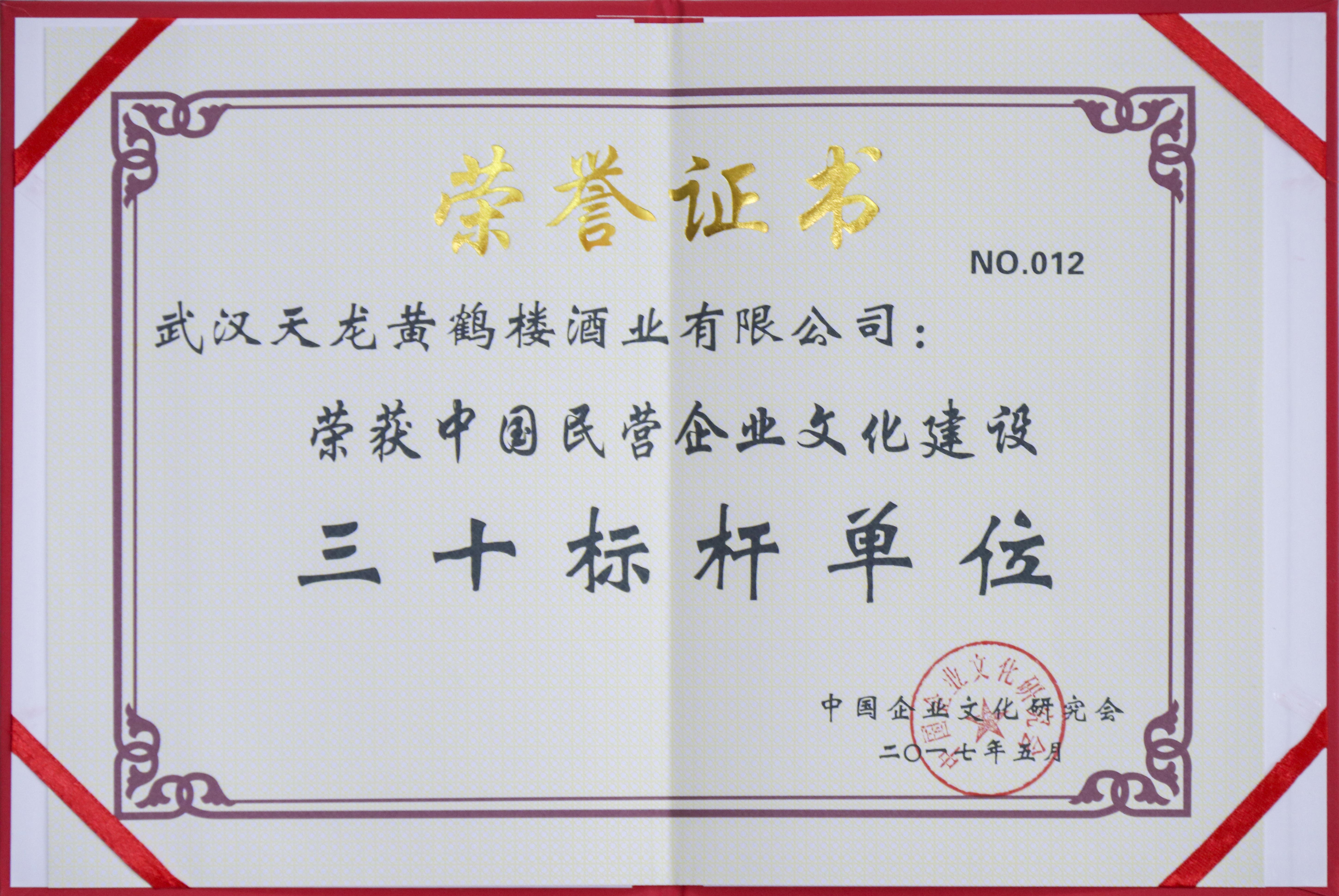 在中國(guó)民營(yíng)企業(yè)文化建設(shè)總結(jié)表彰儀式上,武漢天龍黃鶴樓酒業(yè)有限公司榮獲“中國(guó)民營(yíng)企業(yè)文化建設(shè)三十標(biāo)桿單位”稱號(hào),公司董事長(zhǎng)許鵬榮獲“中國(guó)民營(yíng)企業(yè)文化建設(shè)先進(jìn)個(gè)人”稱號(hào)。