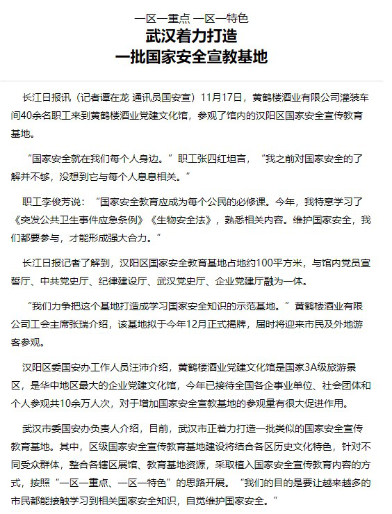 ? ? ? ?近日,黃鶴樓酒業(yè)黨建文化館內(nèi)的漢陽區(qū)國家安全宣傳教育基地榮登長江日報。