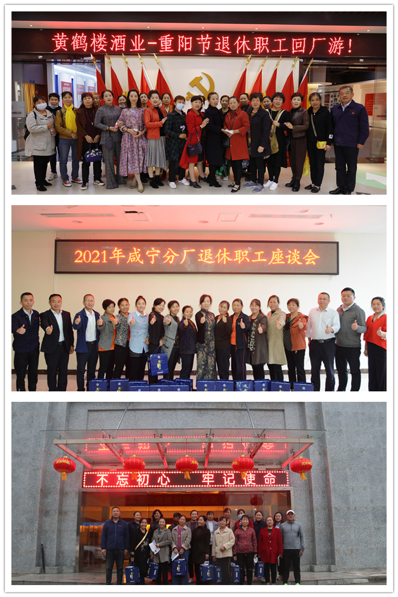 三地回廠活動形式多樣。武漢組織回廠游,帶領老員工們重溫故地,把酒言歡。咸寧、隨州開展座談會,了解退休職工生活現(xiàn)狀并介紹公司目前的發(fā)展形勢,送上佳節(jié)祝福與禮品,組織觀看企業(yè)宣傳片,暢談黃鶴樓酒業(yè)未來發(fā)展新藍圖。