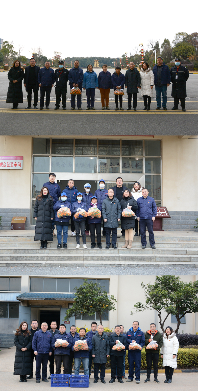 活動(dòng)中,謝毅一行前往釀造、包裝、勾儲(chǔ)、后勤、保安等一線部門,向工作在一線的員工送去砂糖橘,傳遞企業(yè)關(guān)愛,并叮囑他們注意保暖保溫,做好防寒安全生產(chǎn)工作,以飽滿的熱情站好2021年的最后一班崗,為保障公司生產(chǎn)、促進(jìn)產(chǎn)品銷售繼續(xù)努力奮斗。