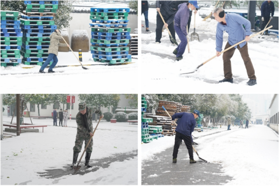 清晨七時(shí)半,志愿團(tuán)隊(duì)早早集合在廠區(qū)開始除雪準(zhǔn)備,為員工步行、車行、旺季發(fā)貨開辟安全通道。往來員工也自發(fā)加入掃雪團(tuán)隊(duì),大家利用鐵鍬、掃帚、推板等工具,齊心協(xié)力、配合默契,認(rèn)真清掃道路積雪,鏟除凝固冰層,在冰雪中開辟暢通之路。