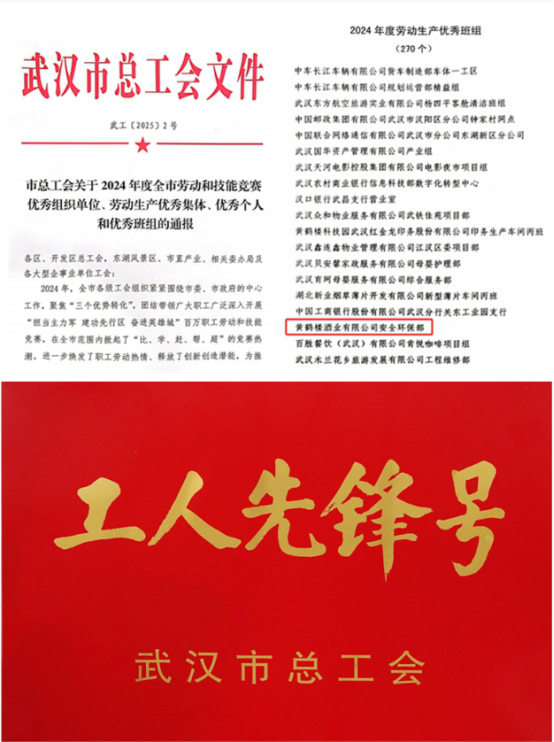 近日,武漢市總工會發(fā)布《市總工會關于2024年度全市勞動和技能競賽優(yōu)秀組織單位、勞動生產(chǎn)優(yōu)秀集體、優(yōu)秀個人和優(yōu)秀班組的通報》(武工〔2025〕2號),其中,黃鶴樓酒業(yè)安全環(huán)保部榮獲“武漢市勞動生產(chǎn)優(yōu)秀班組”“武漢市工人先鋒號”兩項榮譽。