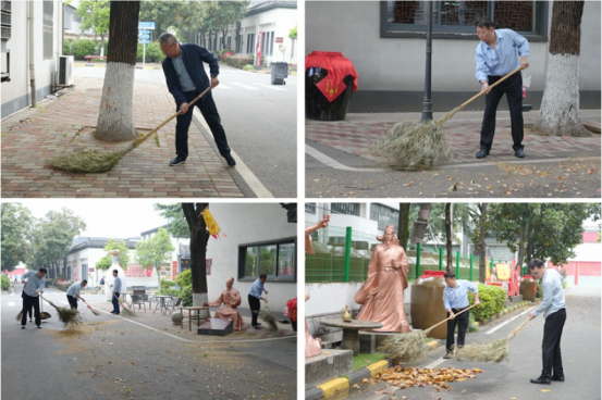 清晨八時(shí)許,行政黨支部黨員們拿起笤帚、撮箕,對(duì)昨日風(fēng)雨過(guò)后的殘枝落葉等進(jìn)行清理。
